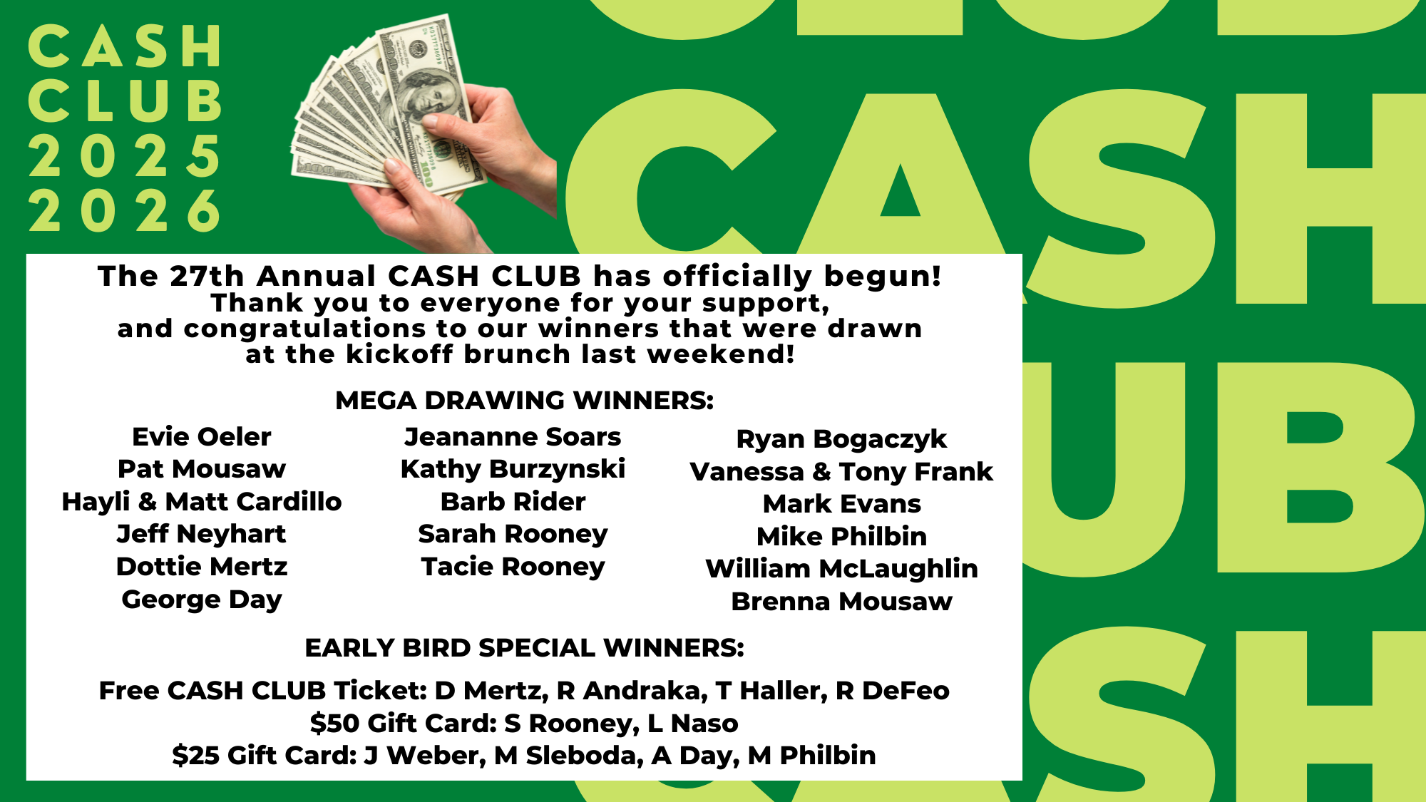 Purchase online HERE (type CASH CLUB in the Notes section) or return your completed ticket stub along with $100 (cash or check made out to St. Ann Catholic Church) directly to the Parish Office or place it in the collection basket in an envelope clearly marked CASH CLUB.