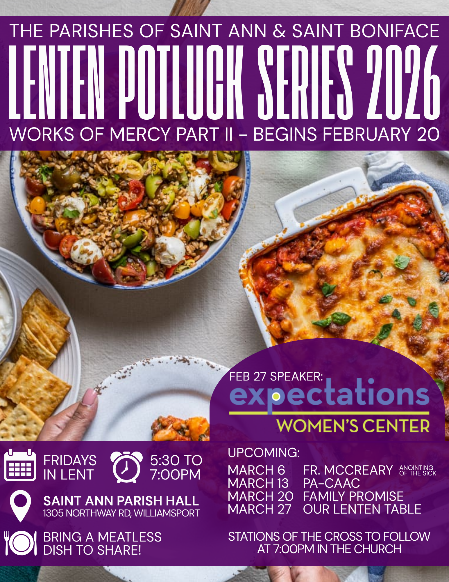 Throughout Lent, the Parishes of Saint Ann & Saint Boniface and our other area Catholic churches are offering many opportunities to pray, fast, and walk this journey together, including: